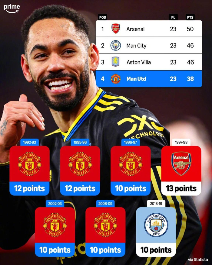 据统计,在英超时代,曼联有五次落后10分及以上的赛季,最终逆转赢得联赛冠军。
